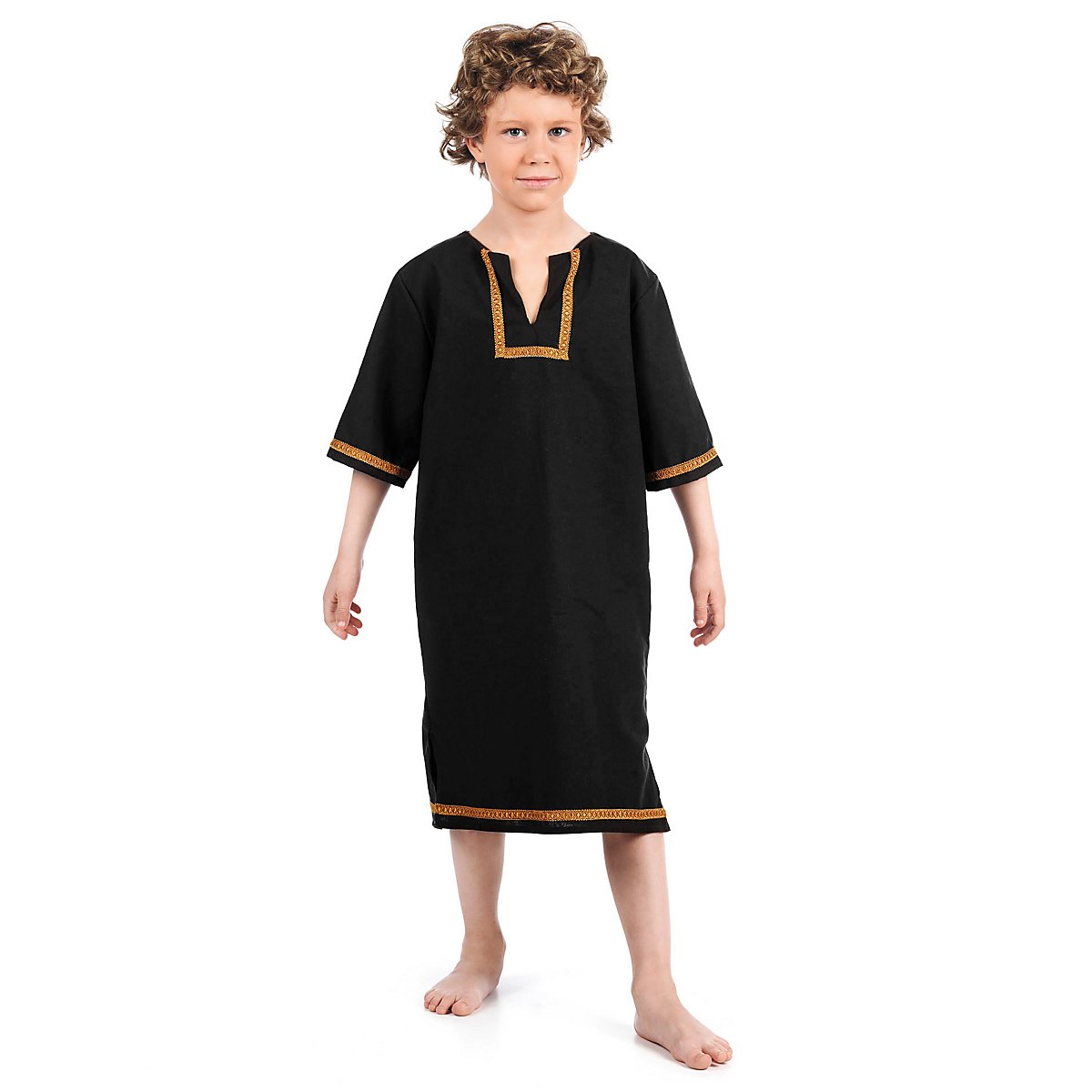 Questa autentica tunica medievale per bambini è un meraviglioso esempio della semplice bellezza dell'abbigliamento medievale. È realizzata in puro cotone, piacevolmente leggero, ed è rifinita con un bordo decorativo color rame intorno alla scollatura, alle maniche corte e all'orlo inferiore. I lati inferiori di questa tunica per bambini sono tagliati.